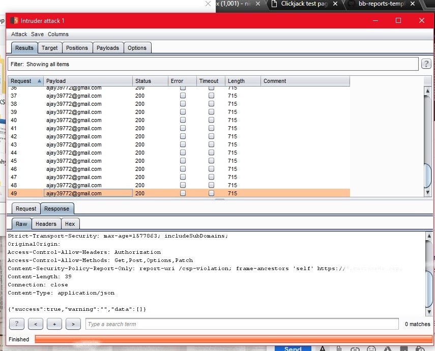and it was a 6 digit password, to reconfirm the combination I requested the password for 100 times by this I got to know that there is no rate limiting implemented on the login page and forgot password page, Now we have the format of the password and nobody is gonna check us if we use it for brute forcing the account but it’s a 6 words password still we get a hell lot of passwords and its nearly (56,800,235,584) this much, now it’s really a lot of passwords for checking one account but we have the password format, So Here we can write a python script for generating the password or there are many other tools which will do the work for you. Thus once we generate the passwords we can use the burp-suit intruder (some thing like this)