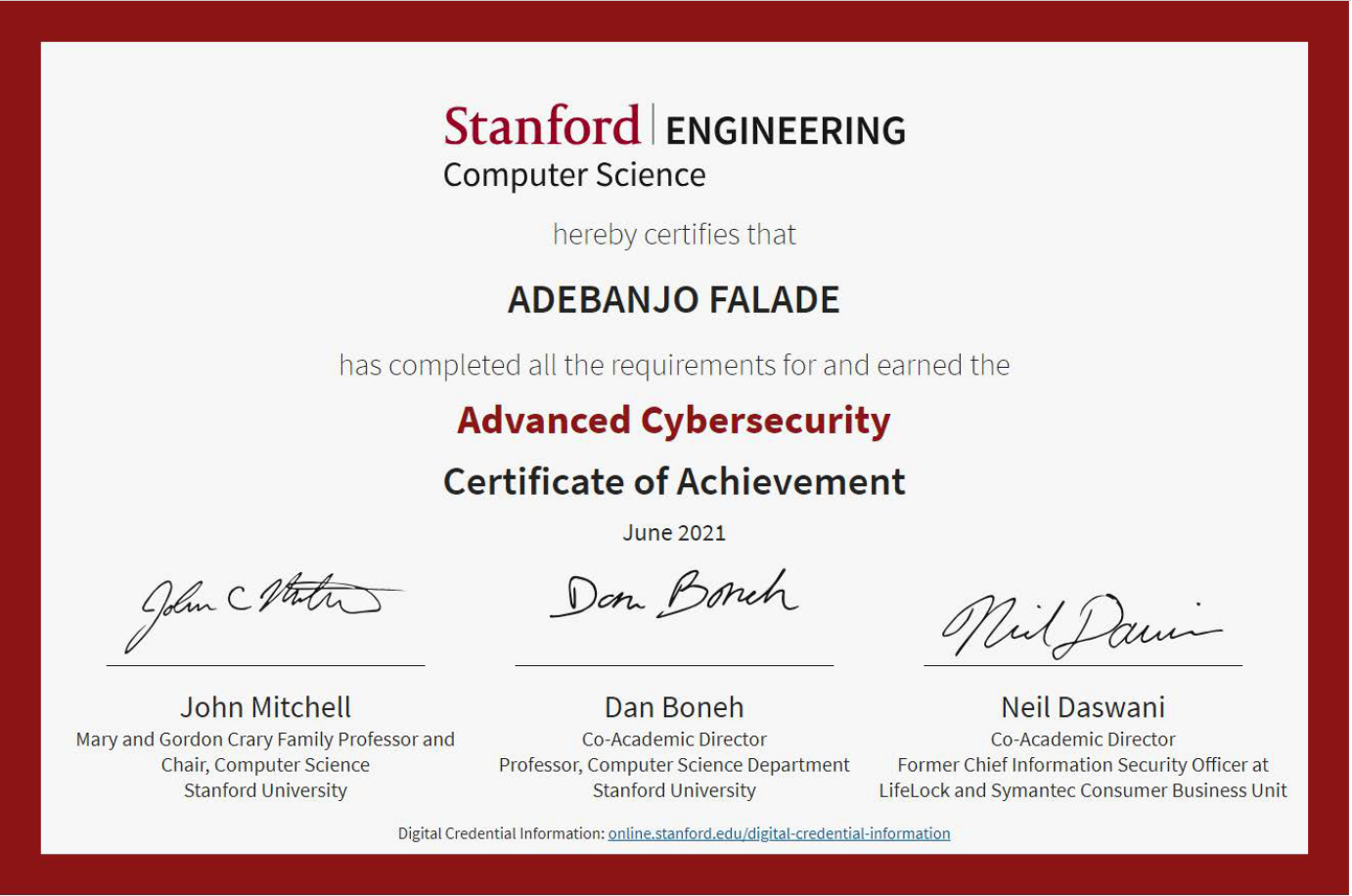 Stanford University Advanced Cybersecurity Certificate